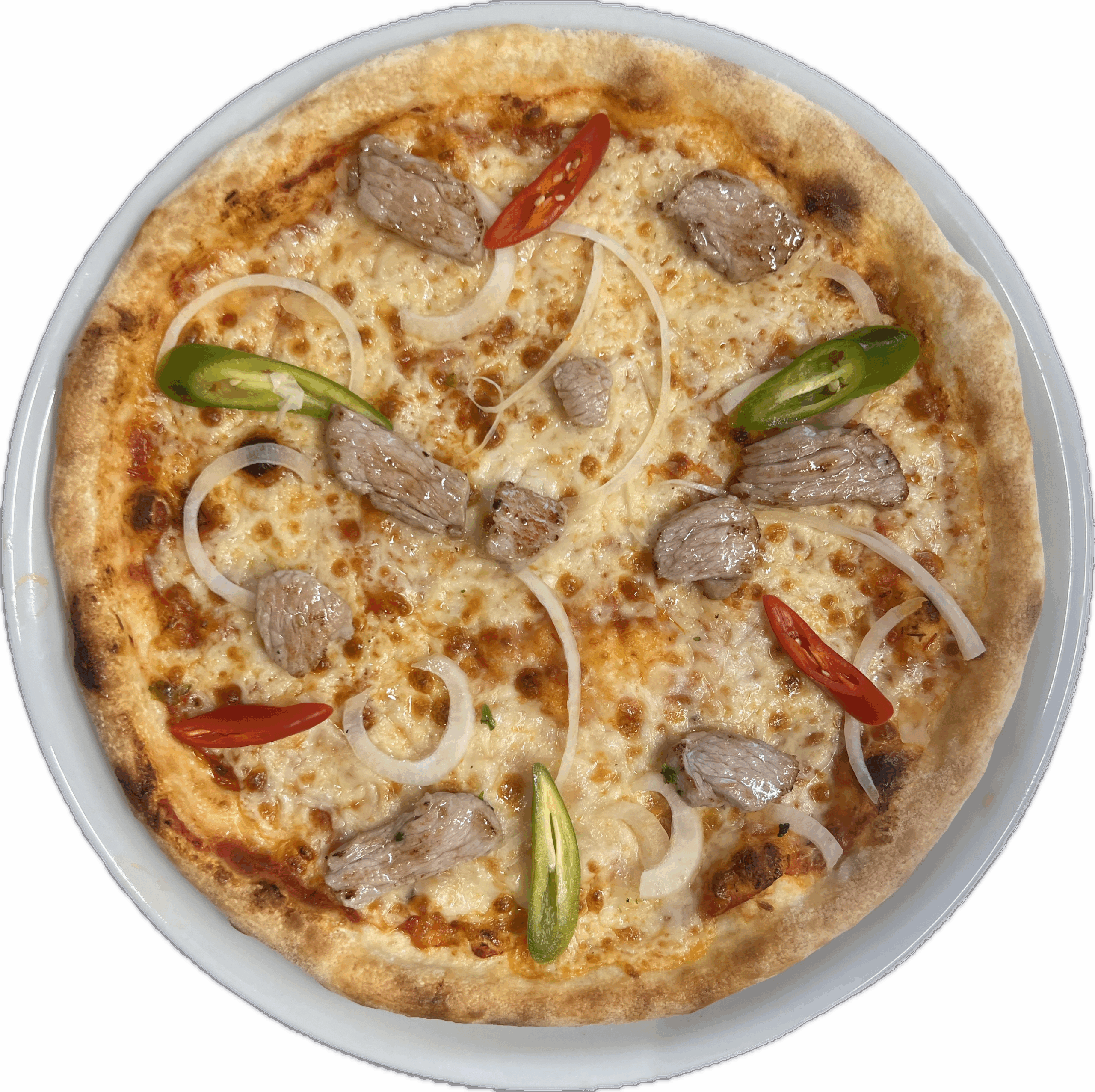 Pizza PadroneTomaten, Mozzarella, Kalbfleisch, Peperoncini, Zwiebeln